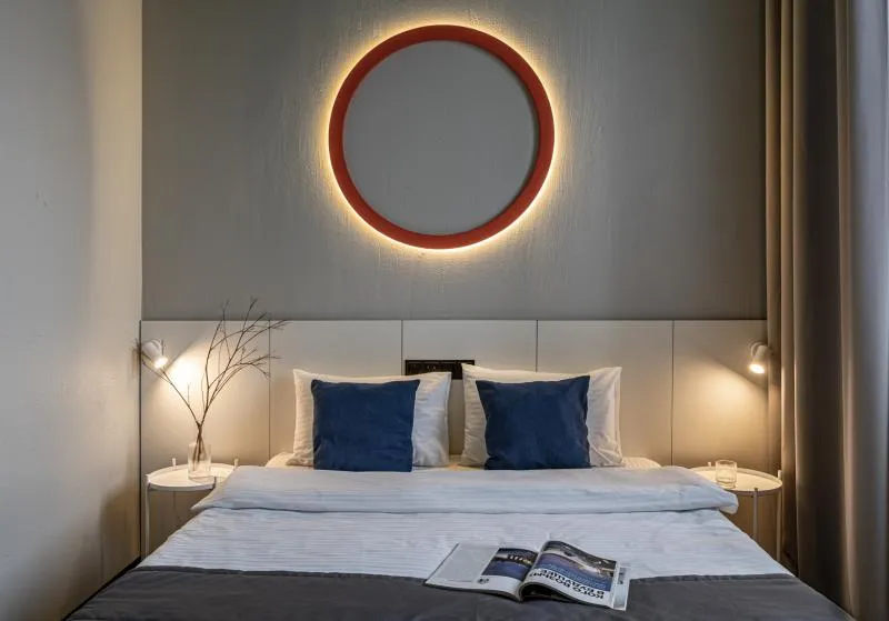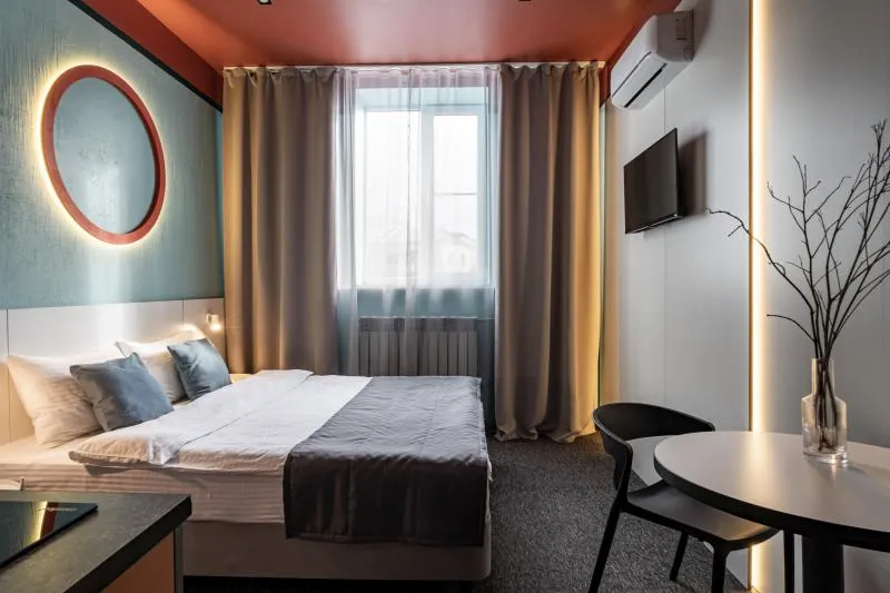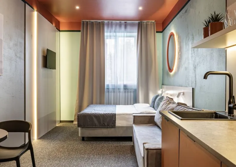 Стильная студия для двоих гостей. Площадь 18 кв.м. Вместимость –2 гостя Двуспальная кровать Бесплатный Wi-Fi Телевизор Мини-кухня с кухонными принадлежностями Душ и туалет