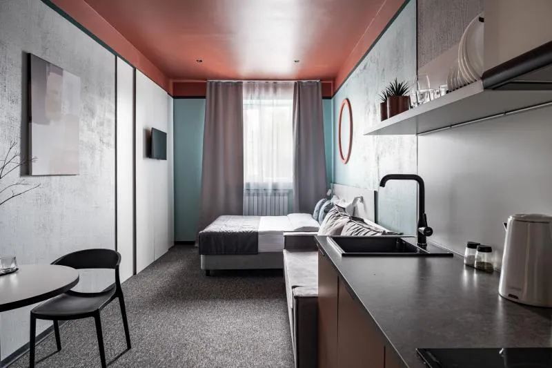Стильная студия для 1-4 гостей. Площадь 25 кв.м. Вместимость – 4 гостя Двуспальная кровать Раскладной двуспальный диван Бесплатный Wi-Fi Телевизор Мини-кухня с кухонными принадлежностями Душ и туалет