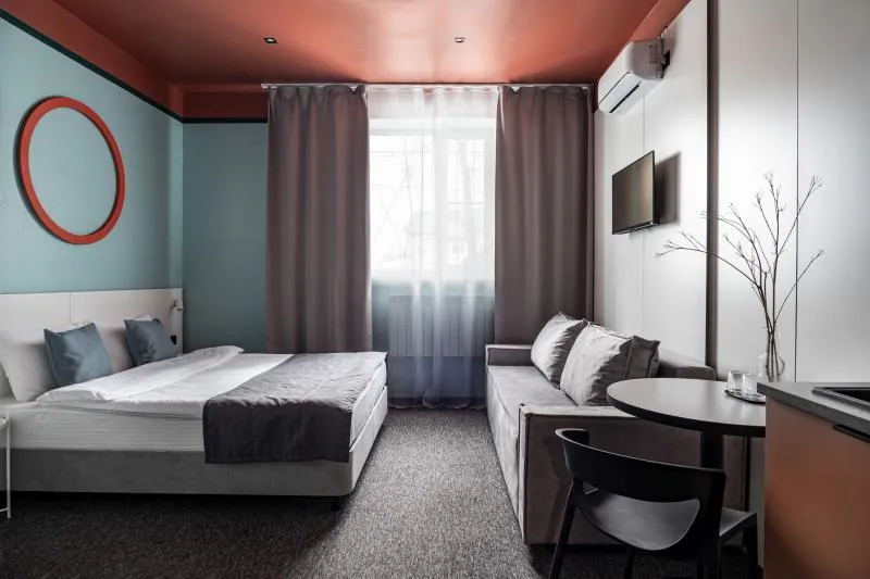 Студия с мини-кухней с двуспальной кроватью и диваном